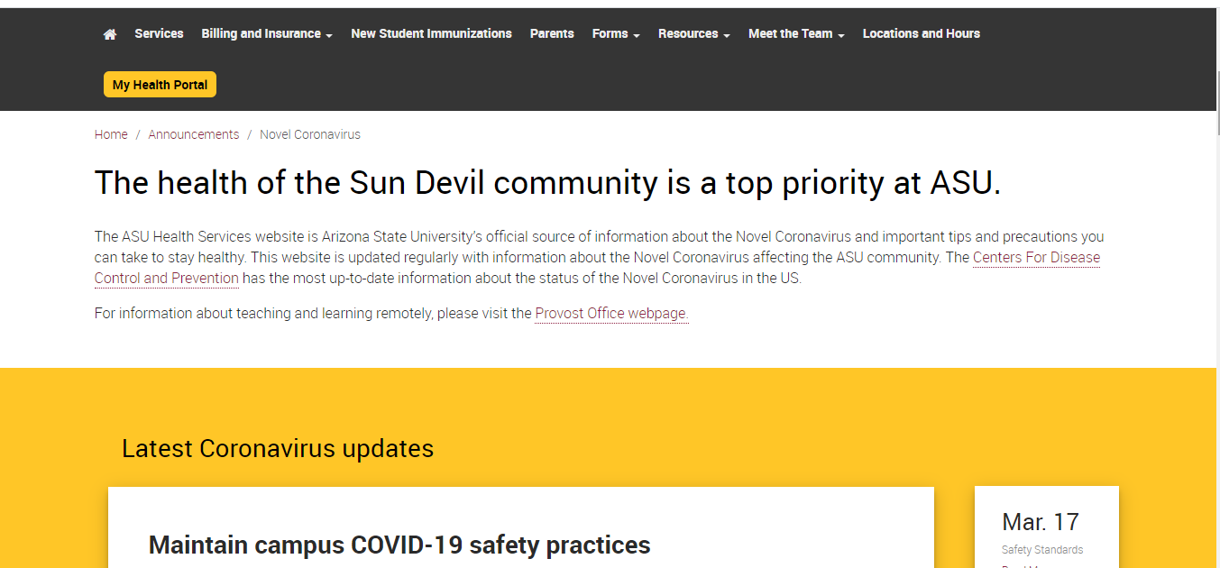 This is the Arizona State University-specific COVID-19 resources for students. I wanted to include this University's specific resources because one of the people I interviewed attends ASU as a student and I want to provide this source as a supplement for some of the difficulty that he mentioned having in finding resources while living as a person experiencing housing instability. The website houses all messages and updates the university has sent to students with regard to the Coronavirus. The site focuses on health and staying healthy for students but seems to lack a clear guide on how to access resources and aid that students may qualify for.
