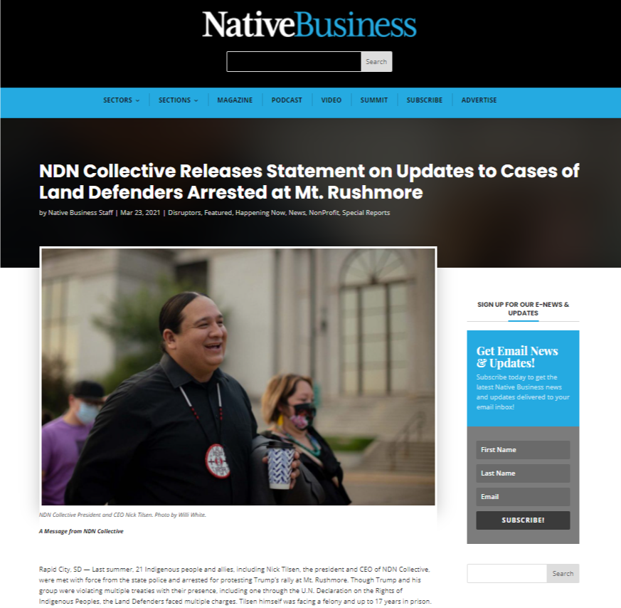 Last summer, 21 Indigenous people and allies, including Nick Tilsen, the president and CEO of NDN Collective, were met with force from the state police and arrested for protesting Trump’s rally at Mt. Rushmore. Though Trump and his group were violating multiple treaties with their presence, including one through the U.N. Declaration on the Rights of Indigenous Peoples, the Land Defenders faced multiple charges. Tilsen himself was facing a felony and up to 17 years in prison.