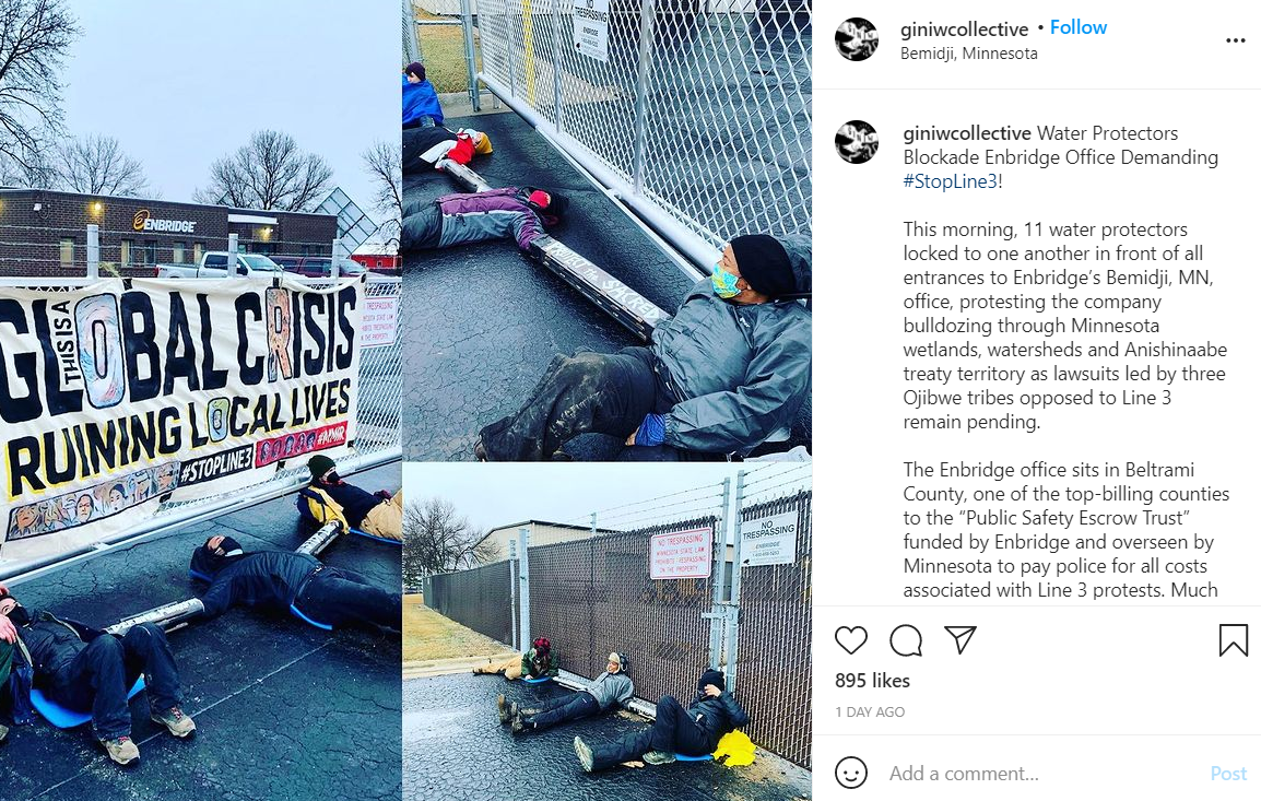 This morning, 11 water protectors locked to one another in front of all entrances to Enbridge’s Bemidji, MN, office, protesting the company bulldozing through Minnesota wetlands, watersheds and Anishinaabe treaty territory as lawsuits led by three Ojibwe tribes opposed to Line 3 remain pending.