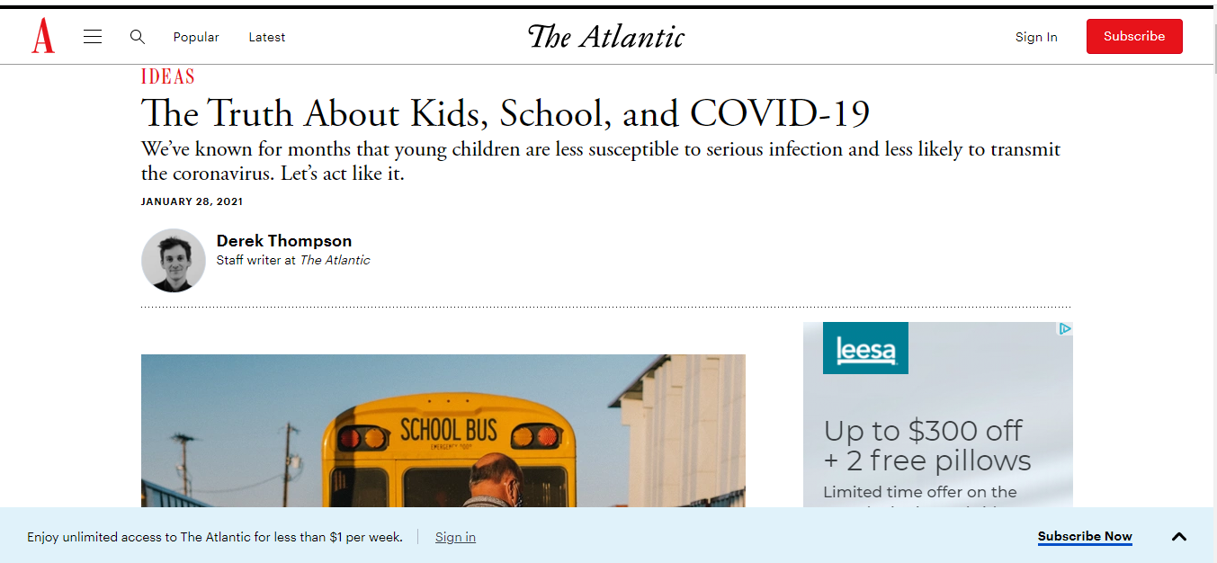 This article, from The Atlantic, analyzes the Centers for Disease Control and Prevention (CDC) assertion that adequate ventilation, proper face coverings, and social distancing in schools will prevent transmission and a surge in COVID-19. The CDCs argument, which the author of the article fully supports, bases their support for in-person instruction on the "preponderance of available evidence," which includes both US studies and European. According to the CDC, people under 18, and young children especially, are less likely to infection and less likely to suffer severe symptoms. Moreover, one comprehensive plan to return children to the class includes access to vaccinations, high-quality scientific information, and strict COVID protocols.