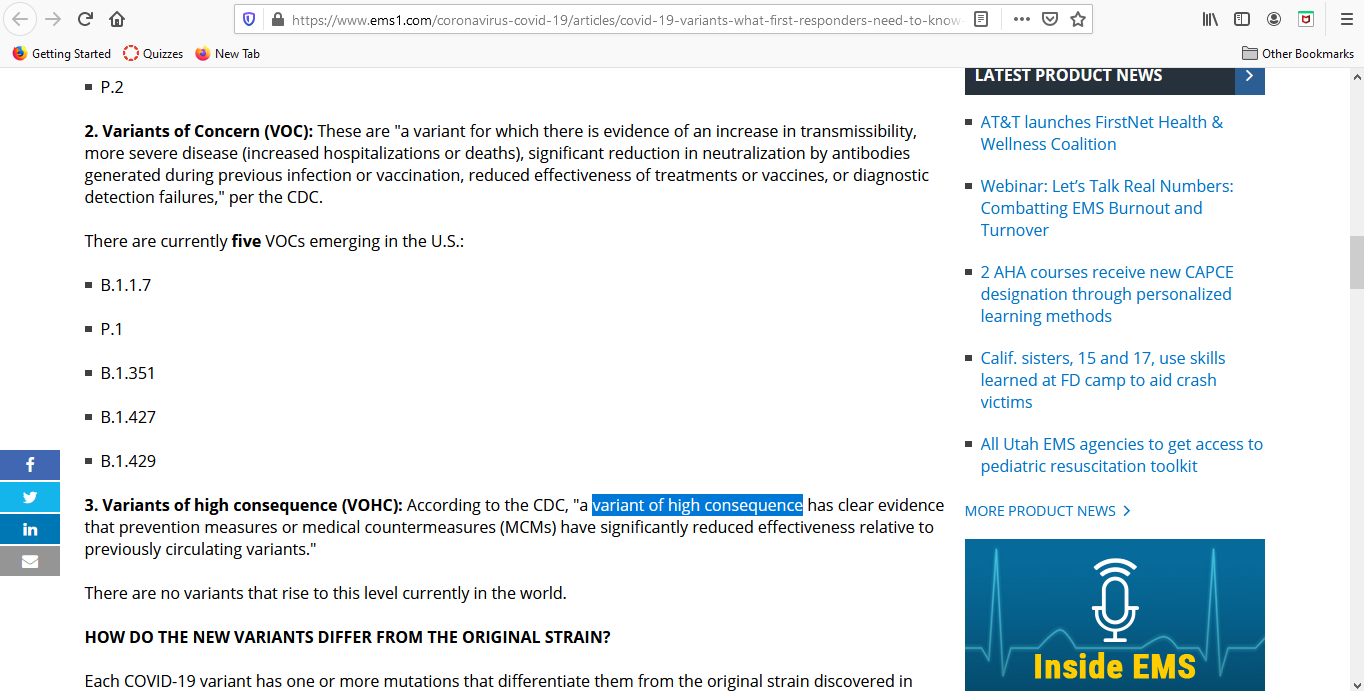 This is an article about the variants of COVID-19 that are either present or emerging in the United States. It is meant to keep EMS providers informed with up-to-date information so that they can provide the best care to patients. Some of the variants are more dangerous/have more symptoms than others. It notes that there is 5 variants of concern, which have increased transmissibility and increased hospitalizations/deaths. While this is not great news, it is a good thing that there are currently no variants in the world that are considered variants of high consequence by the CDC, which essentially means that medicine does not have effective means of treating it. Hopefully this remains the case and we can start to see a drop off of the variants of concern soon.