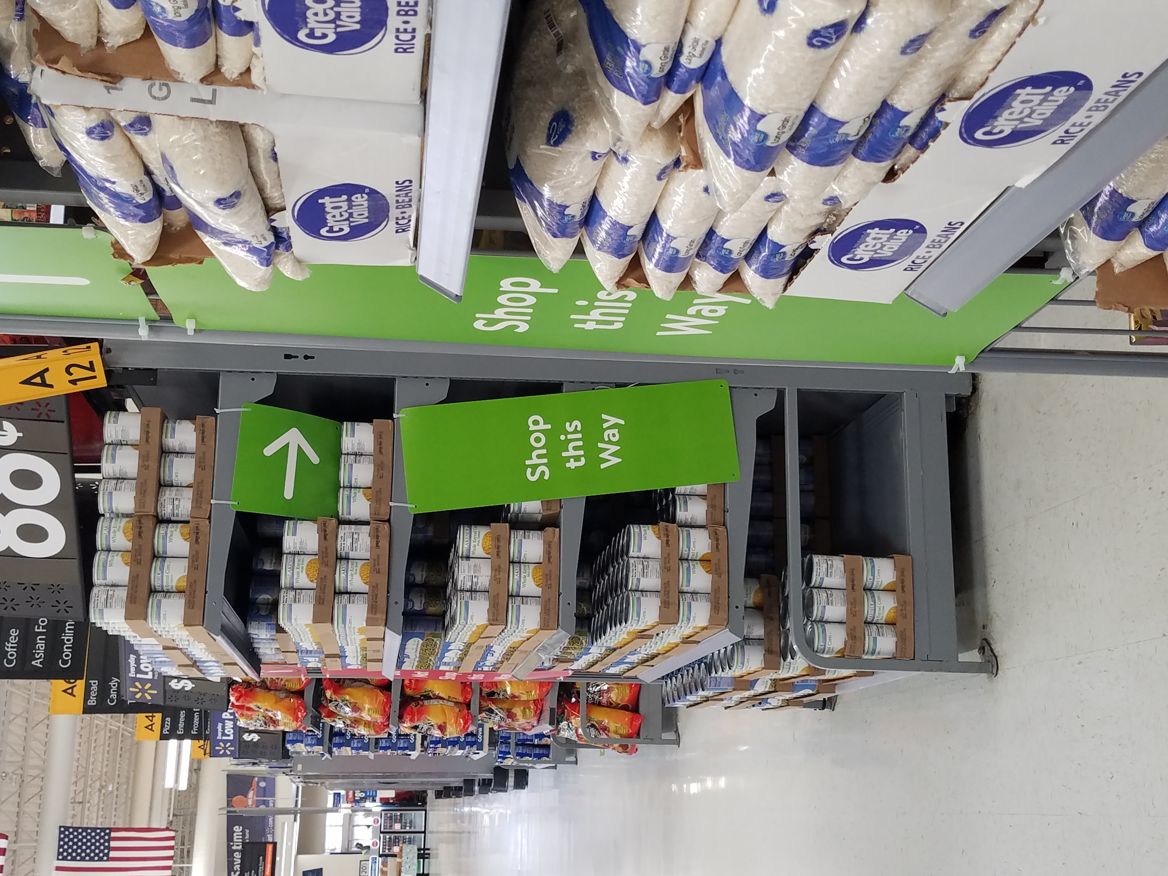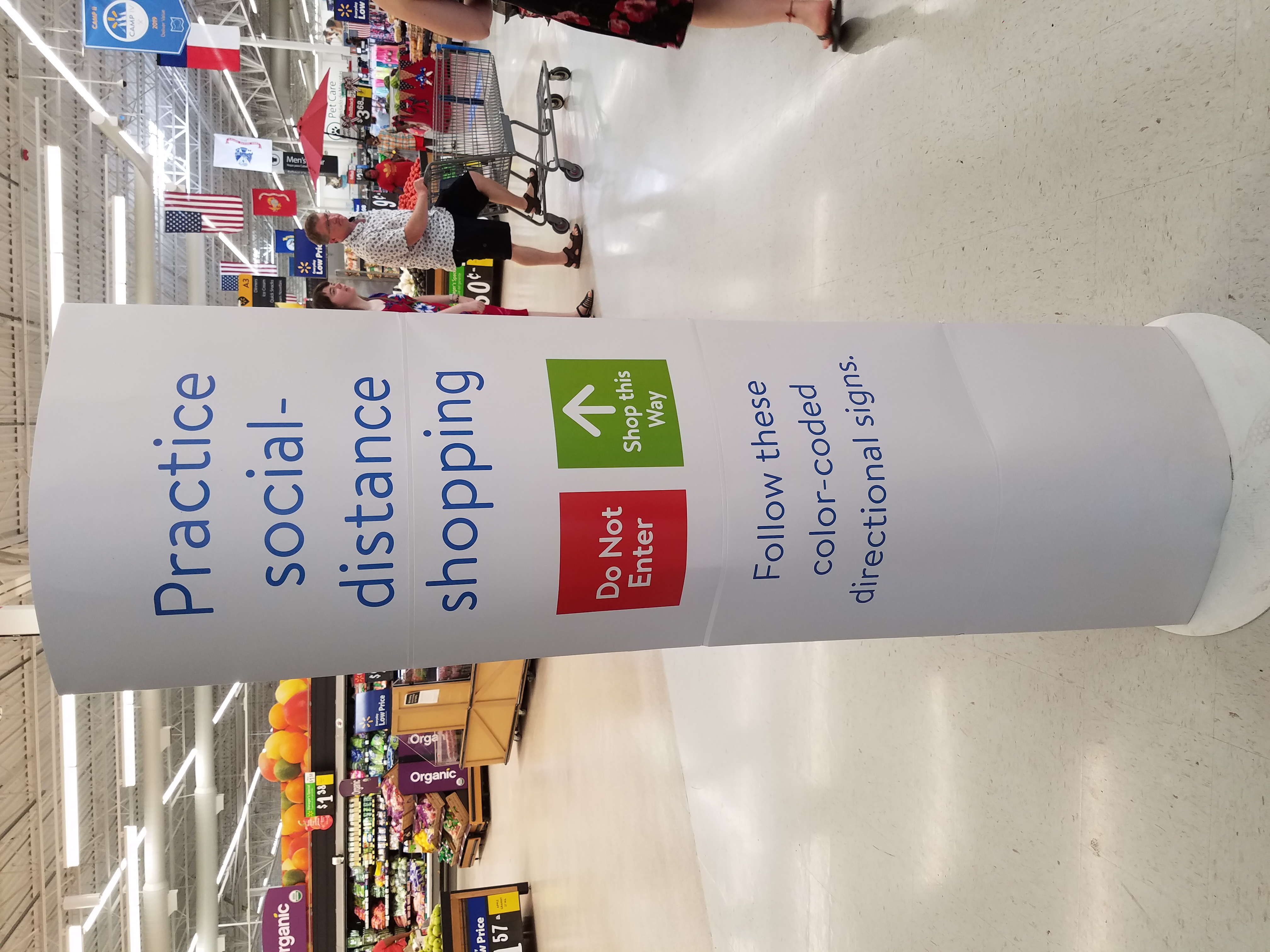 These are pictures of one-way-only signs posted in a Texas Walmart on May 28th and June 11 2020. Many stores such as HEB, Target, and Sam's Club also had similar signs in there stores. The purpose of these signs was to encourage the public to walk in only one direction on each aisle of the store. Stores created an elaborate zig zag pattern using this method. At the time, it was thought that the risk of contracting COVID could be minimized by keeping people from congregating in the same space such as going in and out of the same aisle entrance. Some peopled followed the signs, but it was not a state law so others did not. These photos are important because they show the great extent stores took to try and minimize the spread of COVID. Stores were very concerned about projecting the image of a safe shopping experience in their stores. However, they also hint at the legalistic bent many COVID precautions were beginning to take on. Another implied effect of this arrangement was that by encouraging all people to go in the same direction, stores increased the risk that their customers might catch COVID-19 as everyone was to follow the exact path the person in front of them had. This was the type of situation these signs were supposed to prevent.