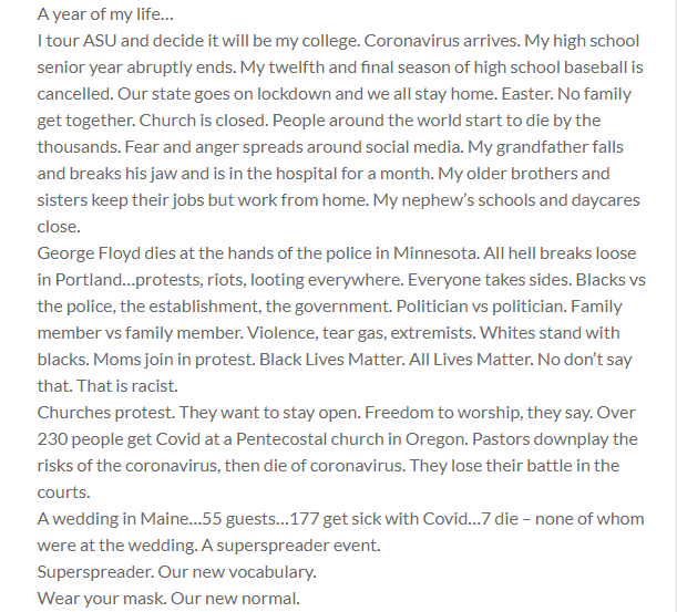 I tour ASU and decide it will be my college. Coronavirus arrives. My high school senior year abruptly ends. My twelfth and final season of high school baseball is cancelled. Our state goes on lockdown and we all stay home. Easter. No family get together. Church is closed. People around the world start to die by the thousands. Fear and anger spreads around social media. My grandfather falls and breaks his jaw and is in the hospital for a month. My older brothers and sisters keep their jobs but work from home. My nephew’s schools and daycares close.