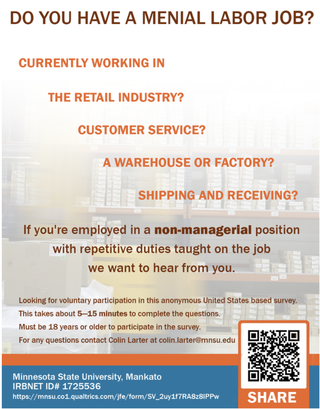 Graduate student Colin Larter from Minnesota State University is seeking participants for a survey focusing on service industry and factory workers to share their experience about their jobs. The survey is completely anonymous, and he is planning to utilize the data he gathers for his thesis. As a former retail worker, he understands the importance of sharing these experiences. This flyer was shared on the Target reddit page, and likely other places on the internet, in hopes that there would be a variety of individuals participating.