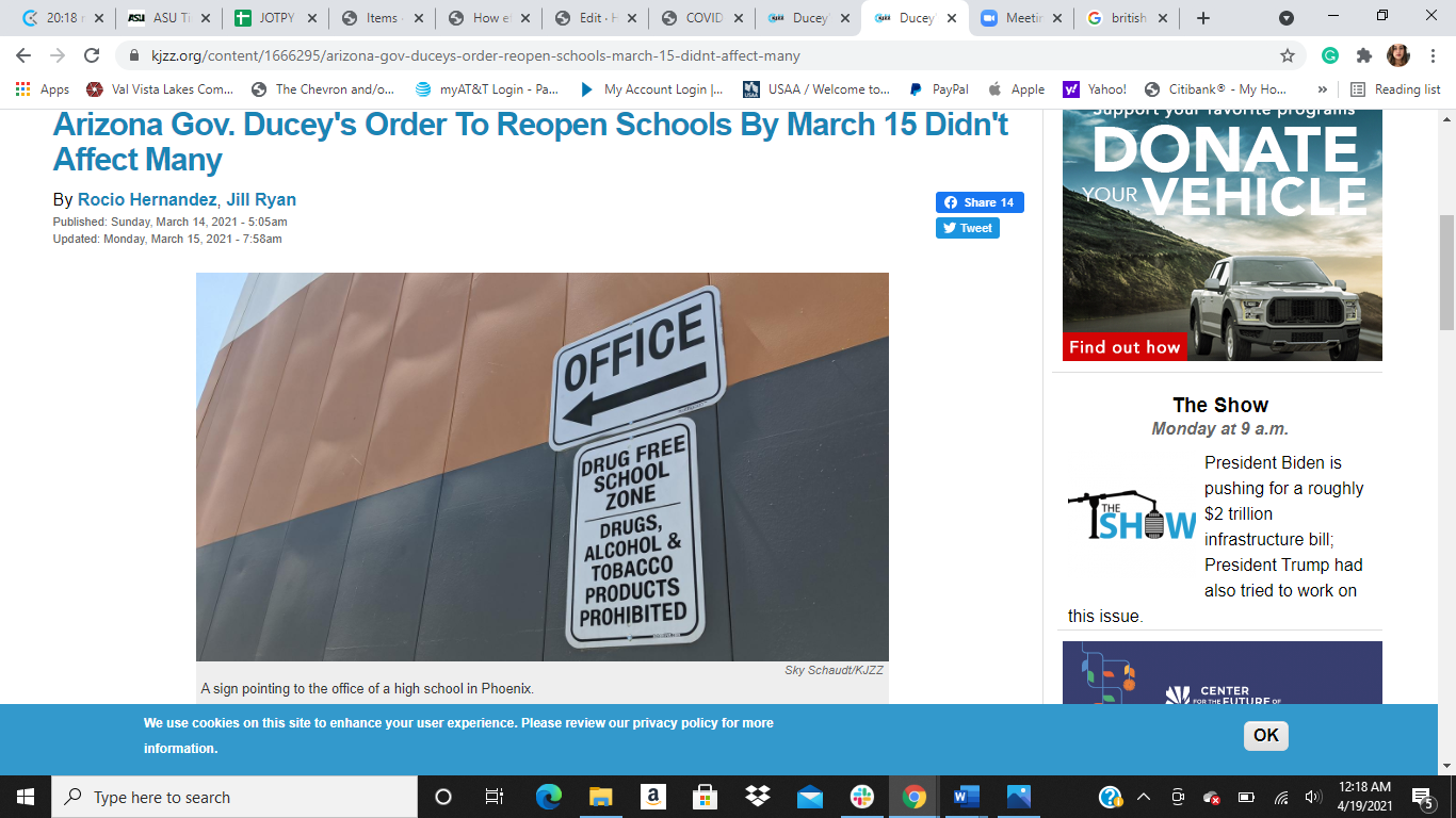 On March 11, 2021, the Arizona State Health Department reported seven counties, including Maricopa, were coded as "substantial transmission rate", however, this rate is technically one level under the serious risk categories. The remaining counties (six) were deemed "moderate" and were set to reopen by March 15. The NPR article argues about the irrelevancy of the order because more than half of the schools in the county are offering some form of in-person instruction, this order didn't change much for that particular school. For some schools, Osborn and Cartwright, the order actually sped their reopening date. In the Osborn case, school officials pushed for reopening because they confirmed that more than half of their teachers had been vaccinated. In places like Coconino and Pinal counties where transmission levels are exceedingly high, the school districts are exempt from reopening. Again, the effectiveness of the March 15th executive order is questionable at best.