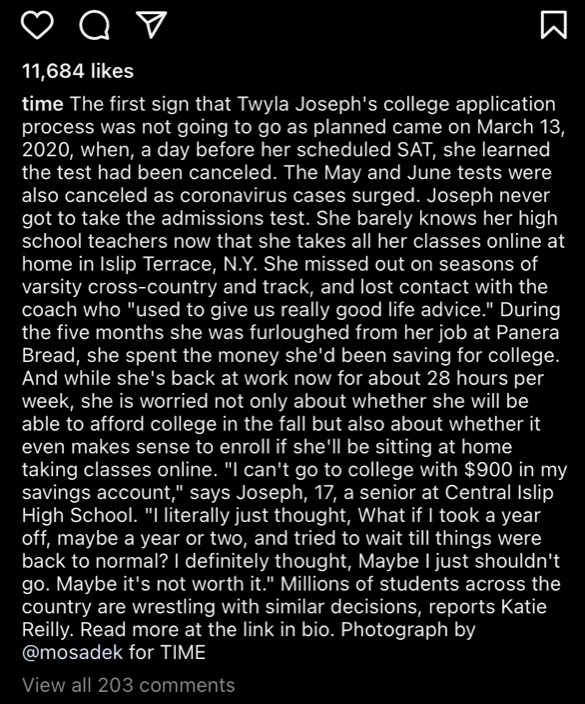 Time magazine explores the effects COVID-19 has had on students, especially those who spent their last year in High School dealing with quarantine and virtual learning.