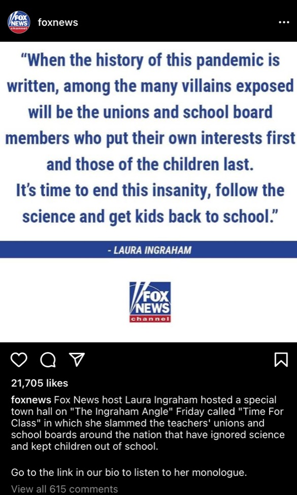 Living in a divided nation I felt it necessary to follow various news outlets. I've realized that many times the truth usually lies somewhere in the middle. Actually, I think the truth usually lies somewhere closer to the left side but that's beside the point. I found this post by Fox News to be interesting because it talks about how conservative TV Host Laura Ingram thinks history will be written. I rarely agree with anything Fox News posts but in this case, I agree that history will record the many villains that have been exposed during the pandemic. I agree that many special interests bodies will be listed but I don't think it will include teachers. I don't think it's farfetched to say that the conservative's push to return back to school has more to do with money and less to do with children. It's funny how she says it's time to "follow the science" where were these conservatives when science said masks help stop the spread of COVID?