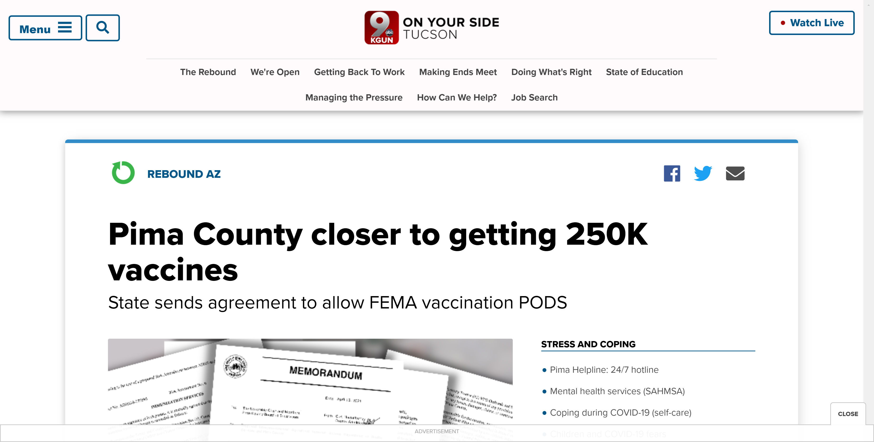 News Article: Pima County (AZ) Vaccinations Approach 250K - FEMA Vaccination Pods