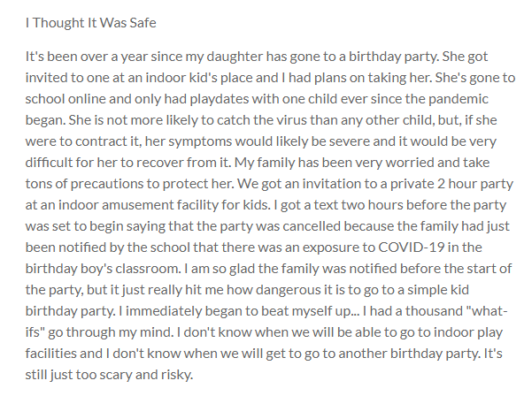 It's been over a year since my daughter has gone to a birthday party. She got invited to one at an indoor kid's place and I had plans on taking her. She's gone to school online and only had playdates with one child ever since the pandemic began. She is not more likely to catch the virus than any other child, but, if she were to contract it, her symptoms would likely be severe and it would be very difficult for her to recover from it. My family has been very worried and take tons of precautions to protect her. We got an invitation to a private 2 hour party at an indoor amusement facility for kids. I got a text two hours before the party was set to begin saying that the party was cancelled because the family had just been notified by the school that there was an exposure to COVID-19 in the birthday boy's classroom. I am so glad the family was notified before the start of the party, but it just really hit me how dangerous it is to go to a simple kid birthday party. I immediately began to beat myself up... I had a thousand "what-ifs" go through my mind. I don't know when we will be able to go to indoor play facilities and I don't know when we will get to go to another birthday party. It's still just too scary and risky.