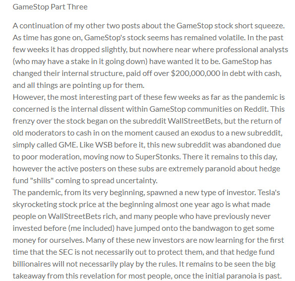 A continuation of my other two posts about the GameStop stock short squeeze. As time has gone on, GameStop's stock seems has remained volatile. In the past few weeks it has dropped slightly, but nowhere near where professional analysts (who may have a stake in it going down) have wanted it to be. GameStop has changed their internal structure, paid off over $200,000,000 in debt with cash, and all things are pointing up for them.