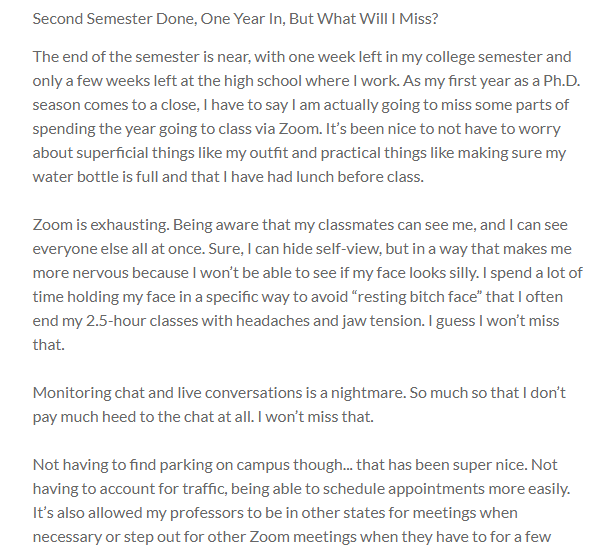 The end of the semester is near, with one week left in my college semester and only a few weeks left at the high school where I work. As my first year as a Ph.D. season comes to a close, I have to say I am actually going to miss some parts of spending the year going to class via Zoom. It’s been nice to not have to worry about superficial things like my outfit and practical things like making sure my water bottle is full and that I have had lunch before class.