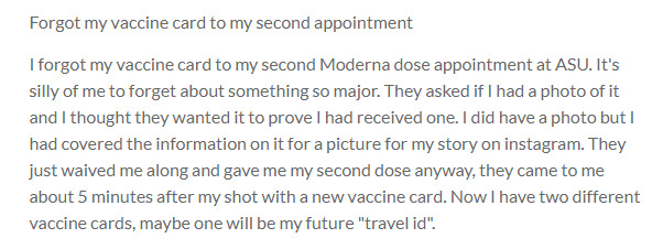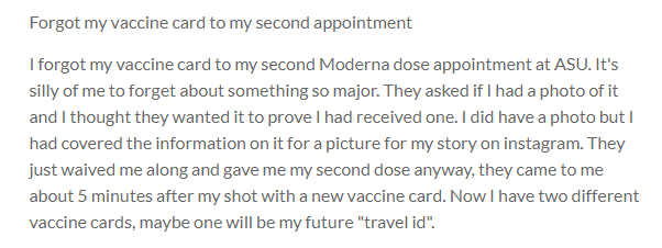 I forgot my vaccine card to my second Moderna dose appointment at ASU. It's silly of me to forget about something so major. They asked if I had a photo of it and I thought they wanted it to prove I had received one. I did have a photo but I had covered the information on it for a picture for my story on instagram. They just waived me along and gave me my second dose anyway, they came to me about 5 minutes after my shot with a new vaccine card. Now I have two different vaccine cards, maybe one will be my future "travel id".
