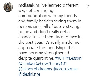 I've learned different ways of continuing communication with my friends and family besides seeing them in person, since all of us are staying home and don't really get a chance to see them face to face in the past year. It's really made me appreciate the friendships that have become strengthened despite quarantine. #JOTPYLesson @a.mlau @how2henry101 @ashes.of.dreams @on_a_kruse @desinistre