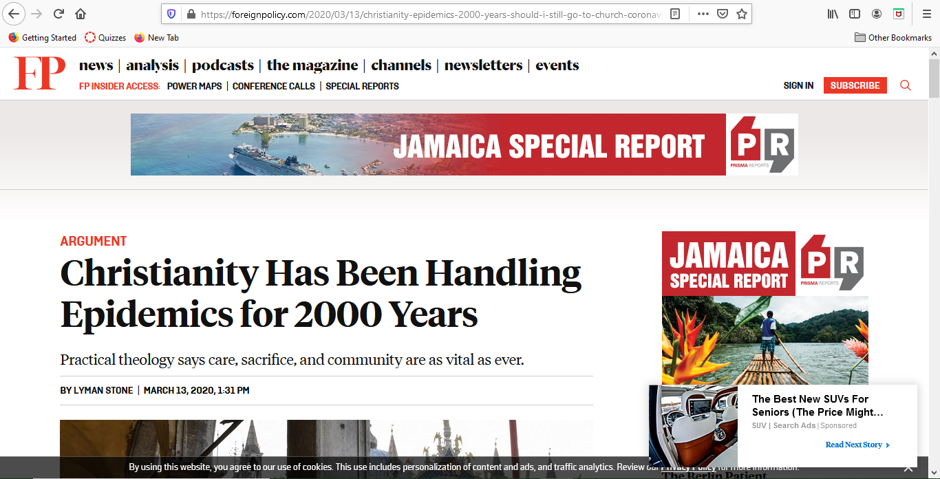 Religions, having been around for millennia, have a unique history of dealing with various pandemics. This article, written by a Lutheran Christian, details the message of Christianity that has been preserved through the centuries. Specifically, according to Stone, Christians have always taught, even if not displayed, that one is to love and care for their neighbor, even to their own detriment. It is not reckless care, where someone may go care for their neighbor and then spread the virus; rather, it is being cautious, but also continuing to love for one’s neighbor.
