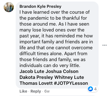 I have learned over the course of the pandemic to be thankful for those around me. As I have seen many lose loved ones over the past year, it has reminded me how important family and friends are in life and that one cannot overcome difficult times alone. Apart from those friends and family, we as individuals can do very little. Jacob Lute Joshua Colson Dakota Presley Whitney Lute Thomas Lovett #JOTPYLesson