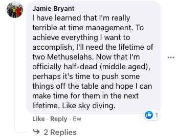 I have learned that I'm really terrible at time management. To achieve everything I want to accomplish, I'll need the lifetime of two Methuselahs. Now that I'm officially half-dead (middle aged), perhaps it's time to push some things off the table and hope I can make time for them in the next lifetime. Like sky diving.