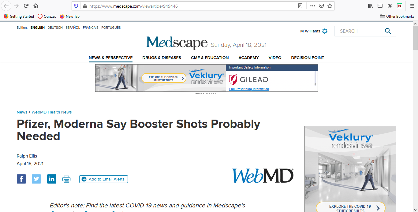 This article is about the Moderna and Pfizer vaccine shots will likely require follow-up booster shots. The executives of both companies announced that it is likely that people that received the vaccine will need their first booster shot within 12 months of receiving the vaccine, then possibly yearly shots afterward. At the end of the article it does note that the Pfizer vaccine is still 93.1% effective 6 months after the vaccine and Moderna reports 90% effective after the 6 month period. However it still seems that we will have to receive booster shots, which is no big deal unless people have the side effects that they had from the original vaccine. This would absolutely prevent many people from following through or even receiving the original vaccine.