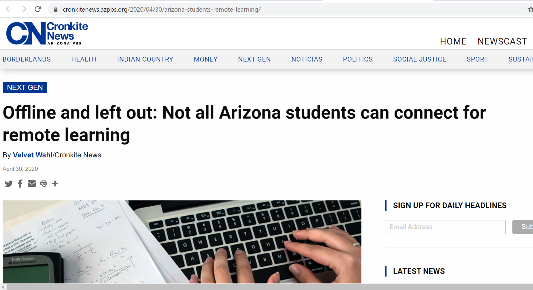 This article focuses specifically on Arizona's efforts to provide students with internet/technology access in order to achieve online learning. It goes into detail about how several Phoenix schools dealt with the pandemic and online learning in the spring semester of 2020 as well as discusses how some students dealt with internet access issues in creative ways, either due to lack of internet or hotspot issues. Some examples are utilizing hotspots or through just going to public areas despite quarantine conditions to complete schoolwork.