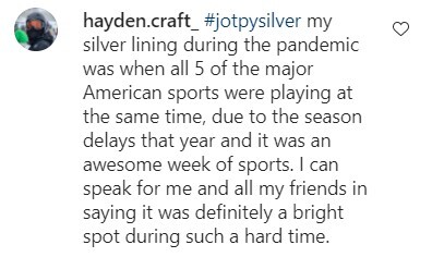 #jotpysilver my silver lining during the pandemic was when all 5 of the major American sports were playing at the same time, due to the season delays that year and it was an awesome week of sports. I can speak for me and all my friends in saying it was definitely a bright spot during such a hard time.