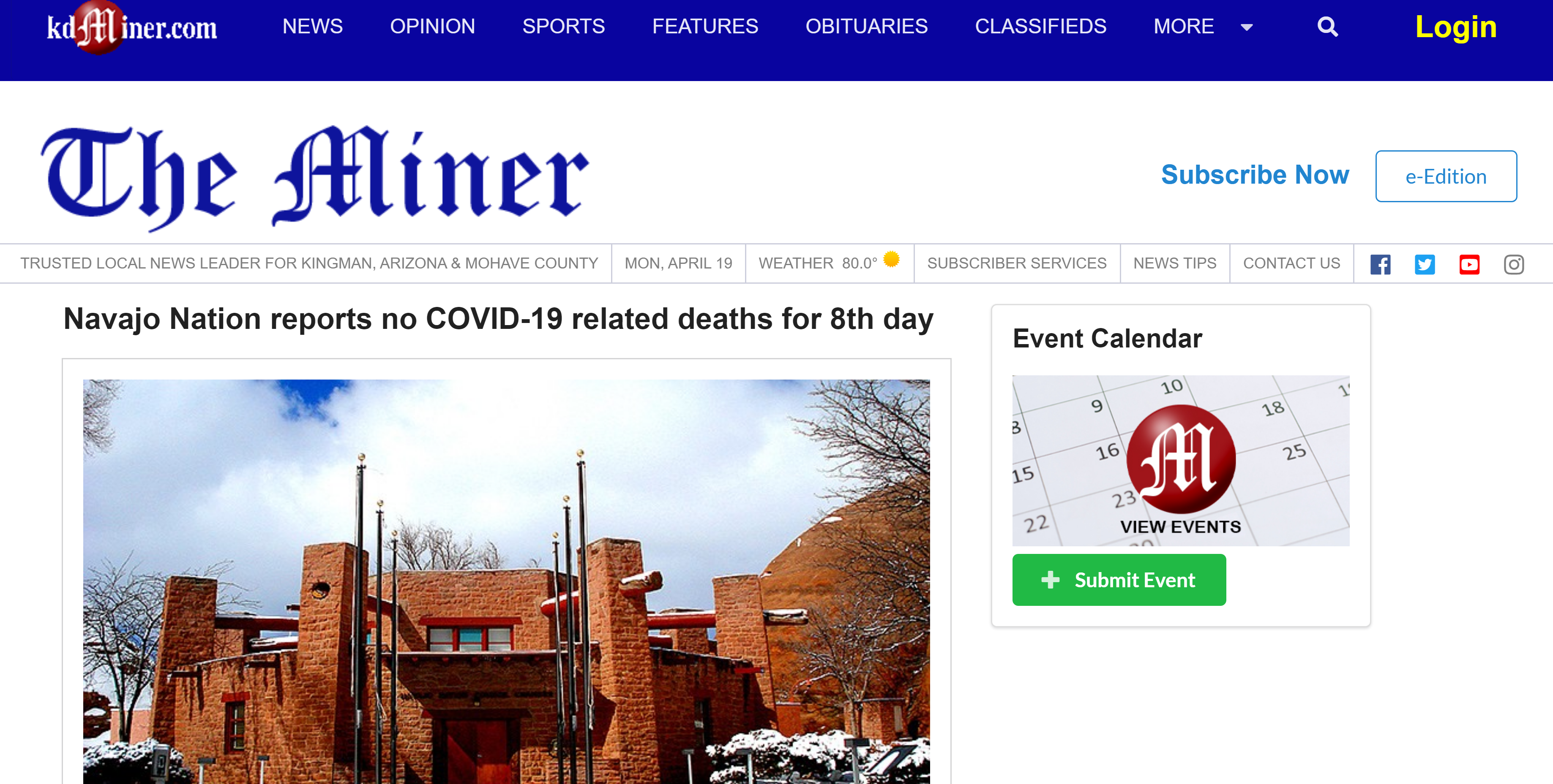 News Article: Navajo Nation reports no COVID-19 deaths for 8th day