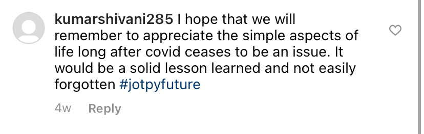 I hope that we will remember to appreciate the simple aspects of life long after covid ceases to be an issue. It would be a solid lesson learned and not easily forgotten #jotpyfuture