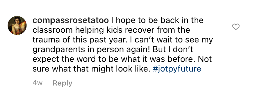 hope to be back in the classroom helping kids recover from the trauma of this past year. I can’t wait to see my grandparents in person again! But I don’t expect the word to be what it was before. Not sure what that might look like. #jotpyfuture