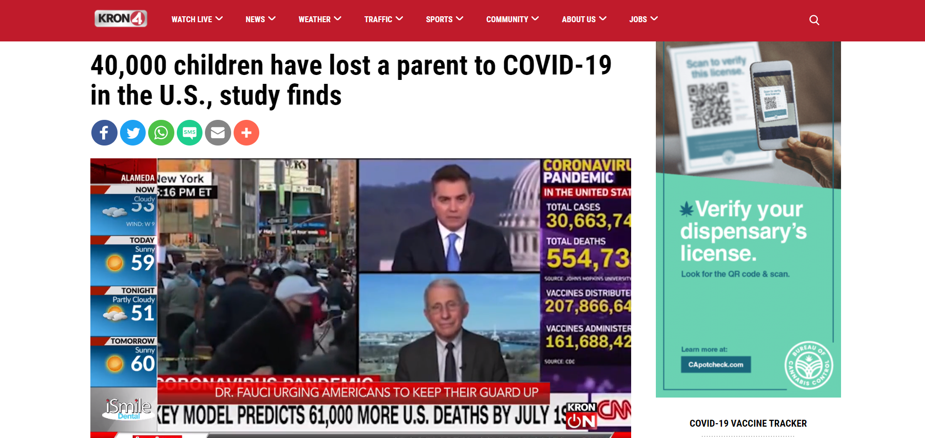 (NEXSTAR) – In a grim reminder of the death toll from COVID-19, a new study published by the American Medical Association found that nearly 40,000 U.S. children have lost one of their parents to the virus.