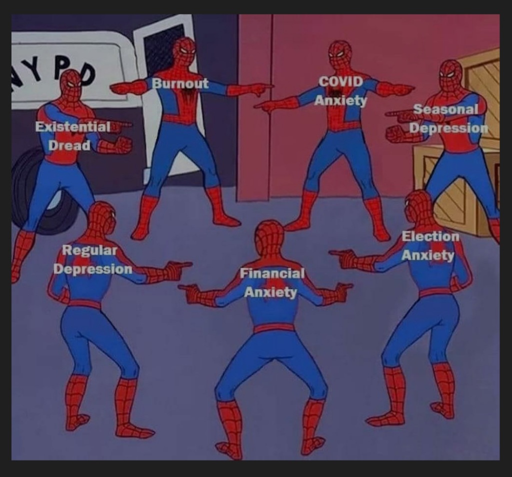 Although the meme is meant to be comedic, I feel that it reflects the reality of the stressors many people faced during the pandemic. To begin, the anxiety that the coronavirus disease brought into the public severely affected the mental health of many individuals across the globe. During the mandated lockdowns, I , like many others around me, began experiencing a decline in my happy hormones. At the time the pandemic restrictions were being put into place, I was living on campus with three other roommates. With the fear of spreading the disease unintentionally, the three moved out of the dorm right away and I was left to be on my own due to personal housing issues taking place at the time. The lack of interaction with anyone took a toll on my mental health. I missed my friends and my mom, I just wanted to be around someone, but we could only have visitors if they were helping us move out.