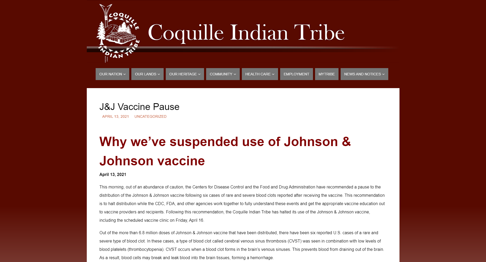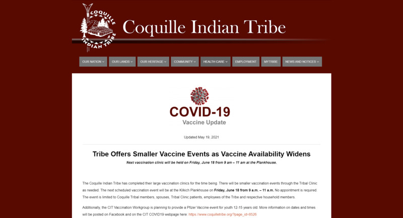 "The Coquille Indian Tribe has suspended use of Johnson & Johnson’s COVID-19 vaccine. This action is taken in response to a federal recommendation involving six reported U.S. cases of a “rare and severe” type of blood clot."