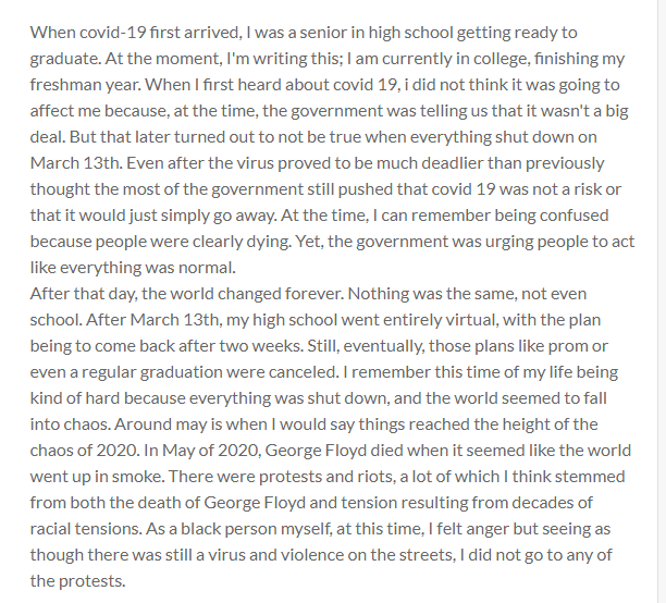 When covid-19 first arrived, I was a senior in high school getting ready to graduate. At the moment, I'm writing this; I am currently in college, finishing my freshman year. When I first heard about covid 19, i did not think it was going to affect me because, at the time, the government was telling us that it wasn't a big deal. But that later turned out to not be true when everything shut down on March 13th. Even after the virus proved to be much deadlier than previously thought the most of the government still pushed that covid 19 was not a risk or that it would just simply go away. At the time, I can remember being confused because people were clearly dying. Yet, the government was urging people to act like everything was normal.