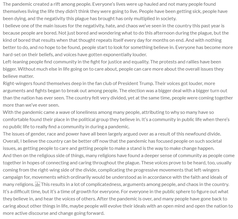 And then on the religious side of things, many religions have found a deeper sense of community as people come together in hopes of connecting and caring throughout the plague. These voices prove to be heard, too, usually coming from the right-wing side of the divide, complicating the progressive movements that left-wingers campaign for, movements which ordinarily would be understood as in accordance with the faith and ideals of many religions. This results in a lot of complicatedness, arguments among people, and chaos in the country. It’s a difficult time, but it’s a time of growth for everyone. For everyone in the public sphere to figure out what they believe in, and hear the voices of others. After the pandemic is over, and many people have gone back to caring about other things in life, maybe people will evolve their ideals with an open mind and open the nation to more active discourse and change going forward.