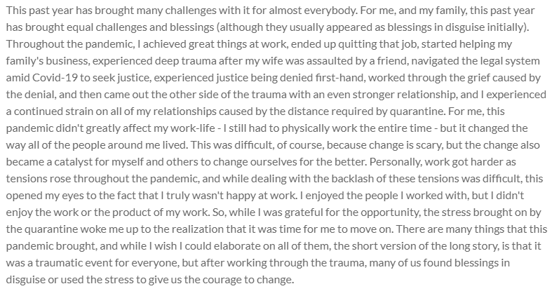 This past year has brought many challenges with it for almost everybody. For me, and my family, this past year has brought equal challenges and blessings (although they usually appeared as blessings in disguise initially). Throughout the pandemic, I achieved great things at work, ended up quitting that job, started helping my family's business, experienced deep trauma after my wife was assaulted by a friend, navigated the legal system amid Covid-19 to seek justice, experienced justice being denied first-hand, worked through the grief caused by the denial, and then came out the other side of the trauma with an even stronger relationship, and I experienced a continued strain on all of my relationships caused by the distance required by quarantine. For me, this pandemic didn't greatly affect my work-life - I still had to physically work the entire time - but it changed the way all of the people around me lived. This was difficult, of course, because change is scary, but the change also became a catalyst for myself and others to change ourselves for the better. Personally, work got harder as tensions rose throughout the pandemic, and while dealing with the backlash of these tensions was difficult, this opened my eyes to the fact that I truly wasn't happy at work. I enjoyed the people I worked with, but I didn't enjoy the work or the product of my work. So, while I was grateful for the opportunity, the stress brought on by the quarantine woke me up to the realization that it was time for me to move on. There are many things that this pandemic brought, and while I wish I could elaborate on all of them, the short version of the long story, is that it was a traumatic event for everyone, but after working through the trauma, many of us found blessings in disguise or used the stress to give us the courage to change.