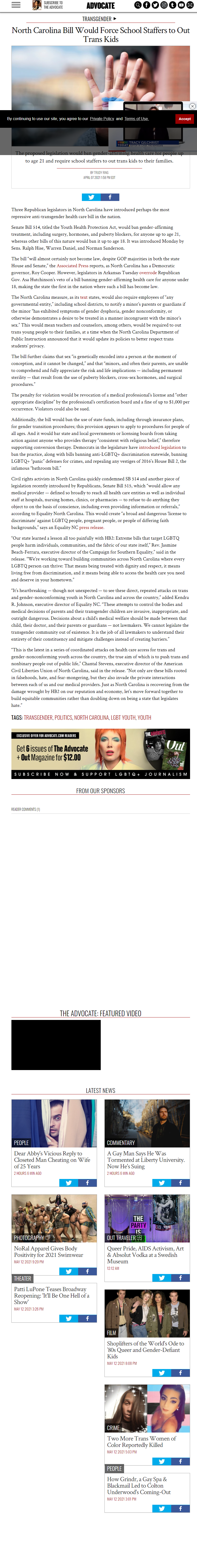 A new law making its way through the North Carolina legislator would force educators to out Transgender students to their parents. It also would not allow for people younger than 21 to have hormones for transgender surgery or to have surgery or anything like that.