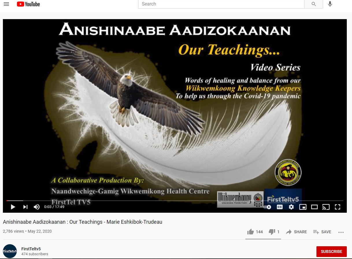 In this video, Anishinaabe elder Marie Eshkibok-Trudeau shares the teachings she learned from her Elders. Eshkibok-Trudeau states that the COVID-19 virus is a strong negative spirit. It is vital to take care of your spirit and physical needs while connecting with the Earth. These practices will help combat any COVID-19 fears that try to take our minds.