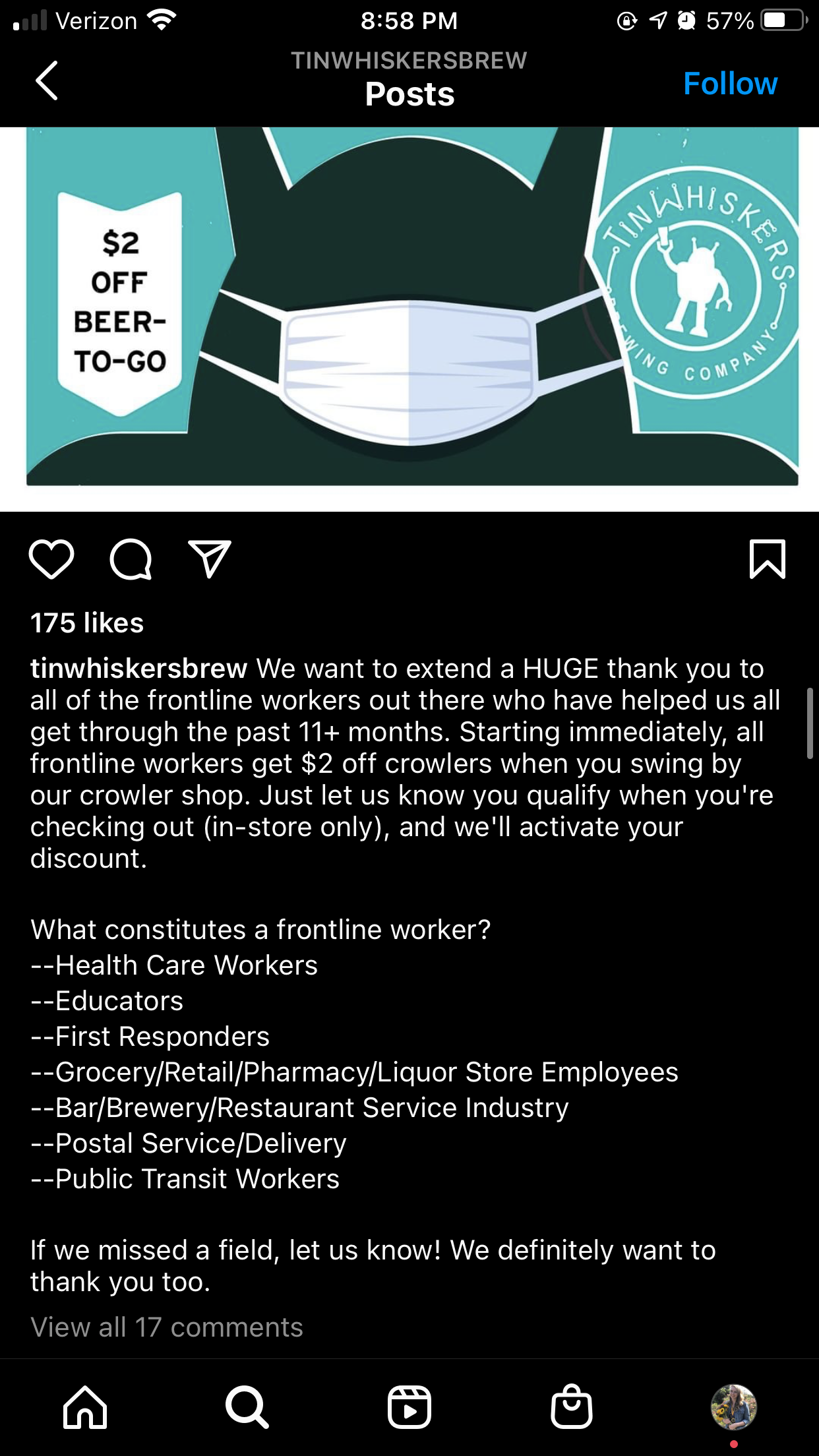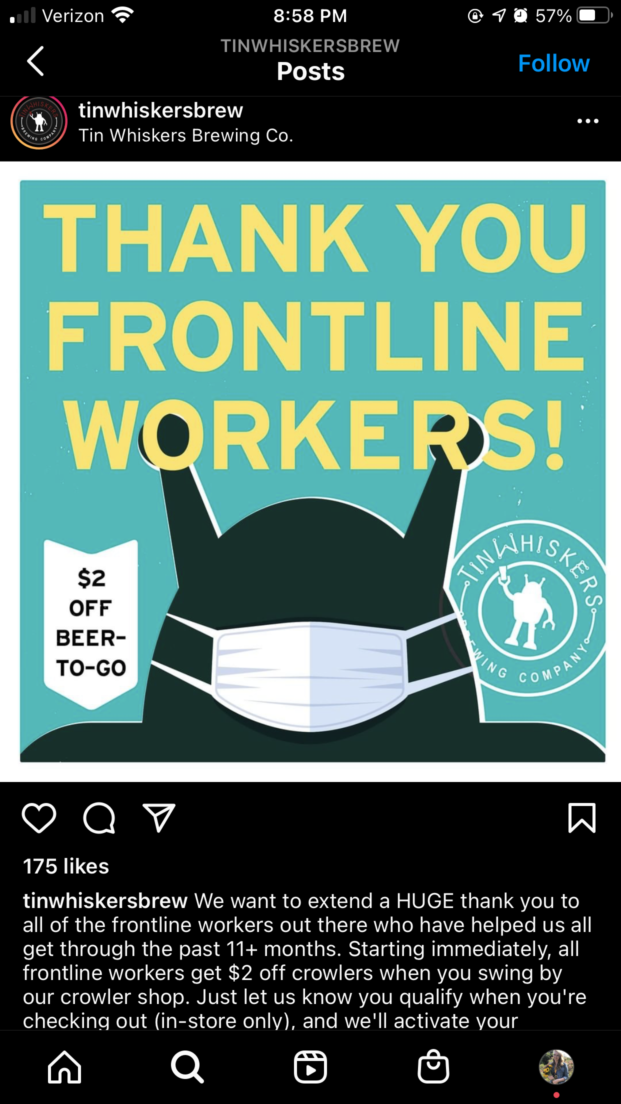 We want to extend a HUGE thank you to all of the frontline workers out there who have helped us all get through the past 11+ months. Starting immediately, all frontline workers get $2 off crowlers when you swing by our crowler shop. Just let us know you qualify when you're checking out (in-store only), and we'll activate your discount.