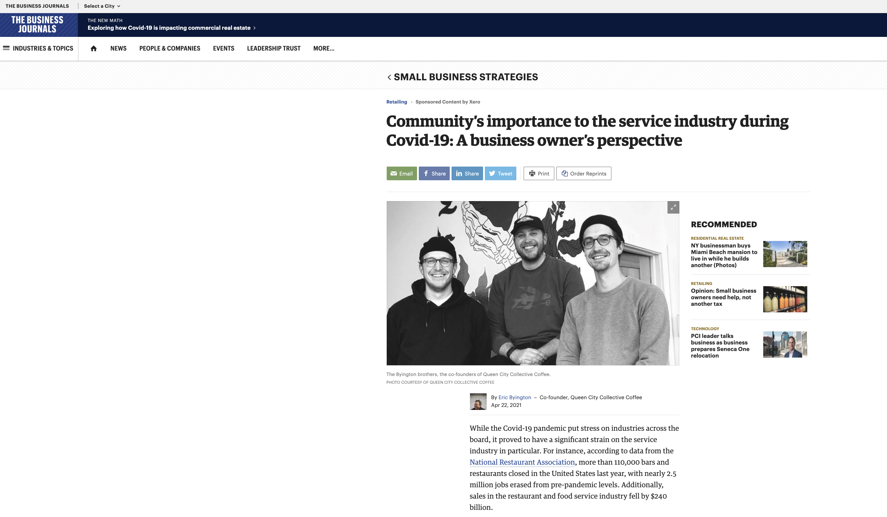 This article, written by small business owners, addresses the challenges faced by the service industry during COVID-19. These owners of a coffee shop share a list of ways that the community can support their local service industry, and why it is crucial to do so. They make it clear that it's not simply about buying a product; instead, it is about building a community and supporting those that you care about, which goes both ways. If you support small business owners and show that you're there for them, they in turn will give back to the community in any way that they can, creating a caring environment. The lessons they share are so important to keep in mind as we are still dealing with the pandemic, so that we can build a support system that lasts long past when the pandemic is over.