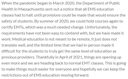When the pandemic began in March 2020, the Department of Public Health in Massachusetts sent out a notice that all EMS education classes had to halt until provisions could be made that would ensure the safety of students. By summer of 2020, we could hold courses again to certify EMTs, which was a much needed change. Unfortunately, the requirements have not been easy to contend with, but we have made it work. Medical education is not meant to be remote, it just does not translate well, and the limited time that we had in-person made it difficult for the students to truly get the same level of education as previous providers. Thankfully in April of 2021, things are opening up even more and we are heading back to normal EMT classes. This is going to make things much easier for everyone and hopefully we can keep the restrictions out of EMS education moving forward.