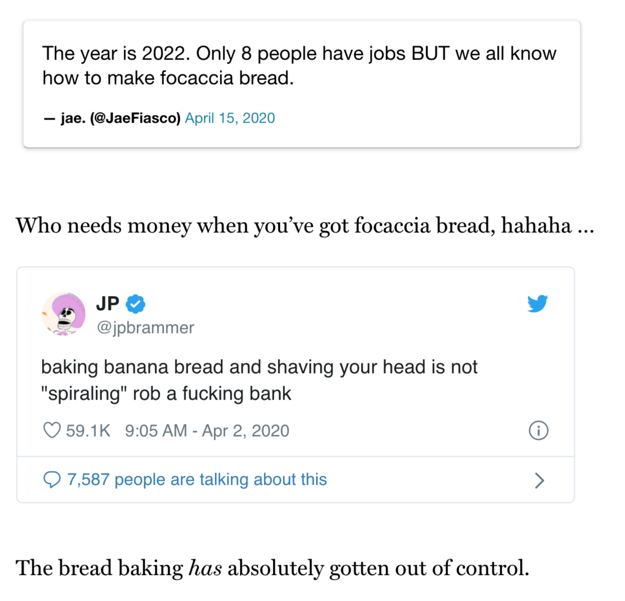 These memes humorously sum up the way 2020 went for us. We were stuck at home. Many of us baked bread and didn't get dressed for days. Our poiticians told us one thing one day and then contradicted it the next.
