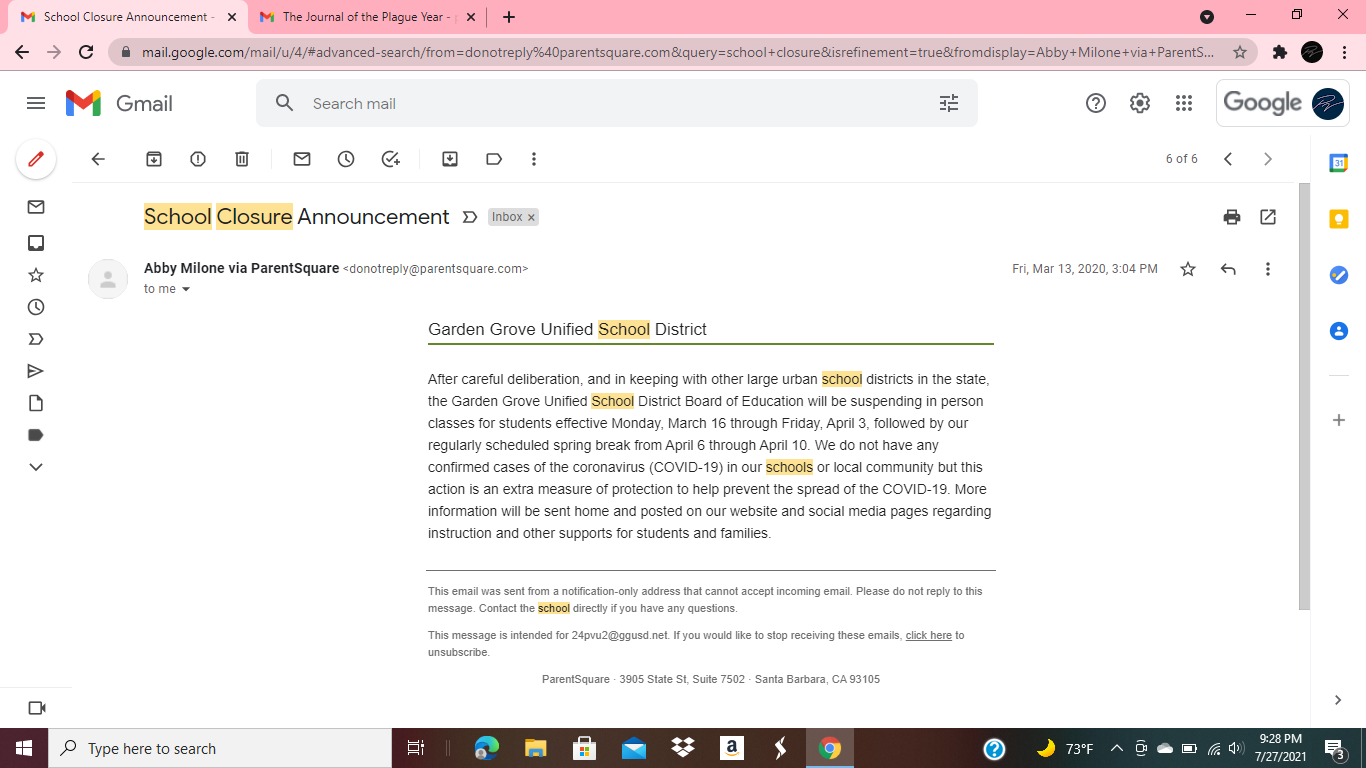 She told me to check my email and when I did, the screenshot above told us that we were not going to go back to school until after Spring Break.