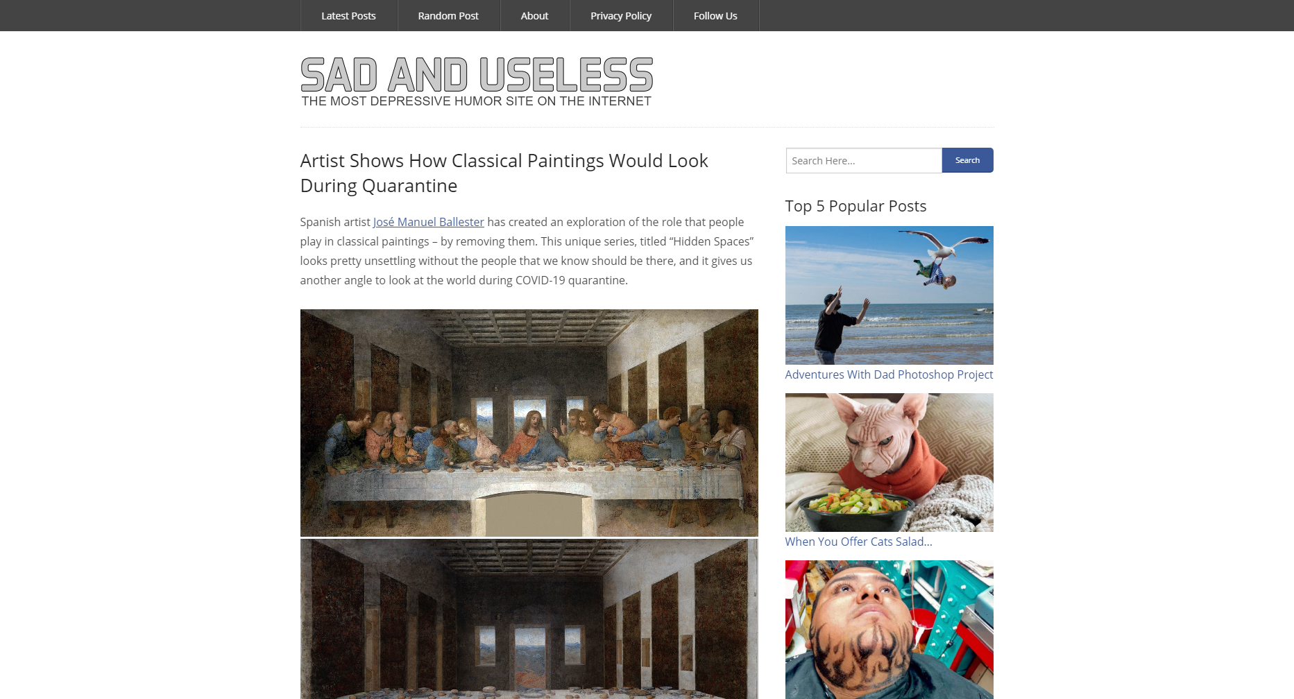 Quarantine was a hard time on us all; it hit most of us out of nowhere and left us locked inside our homes for what an eternity and for most people, they had to spend that time alone. I did not go out a lot during this time so I went online and chose the pictures that I believe best represent what mine and many others felt their quarantine was like. Jose’ Manuel Ballester, a Spanish artist recreated iconic historical paintings and removed the most pivotal part in each of them; the people. Dubbed “Hidden Spaces”, Ballester recreates a series of works in which he is able to present an angle of how the world is like during quarantine. Iconic masterpieces like the Last Supper is left to just an empty table. Ballester is able to show the loneliness and emptiness that quarantine has left people in, by removing the people from the paintings Ballester thus leaving the audience with a certain feeling of discomfort reminiscent of the lack of company and interaction leaves us feeling when we are quarantined and I really resonated with these photos because that is how I felt during this quarantine.