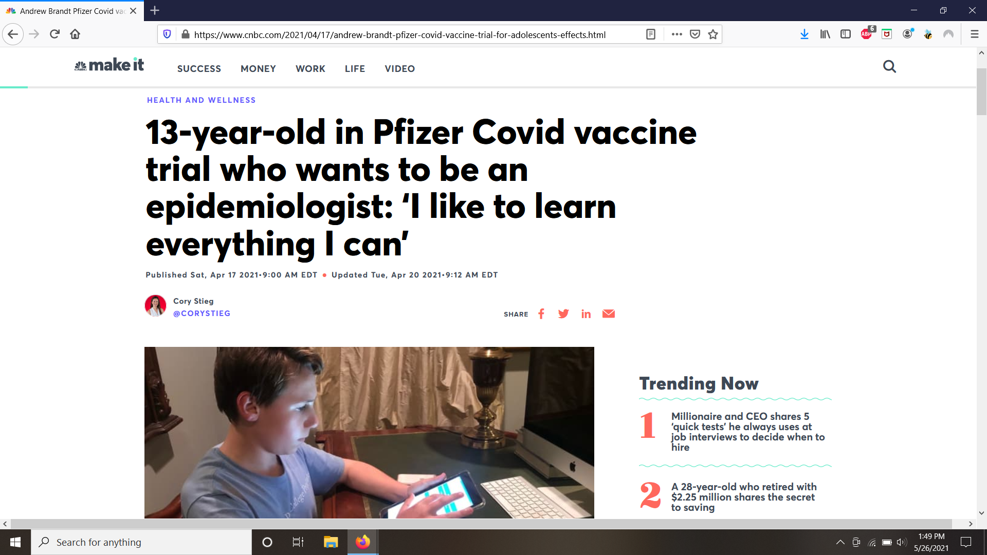 Recently CNBC has released an article on my story in the Pfizer Vaccine Trial. I got interviewed about a week ago, and I helped in the making of the article. It is on a division of CNBC called CNBC Make It. CNBC Make It is a section of CNBC that specializes in money, wellness, and heartwarming stories. I have gotten to know the writer, Cory Stieg, well and it was great working with her. The article goes into detail about how the trial works and my experience with the trial. This experience has been amazing from both ends, Pfizer and CNBC. I hope that I inspired others to make a change in the world and to try and pursue your passions.
