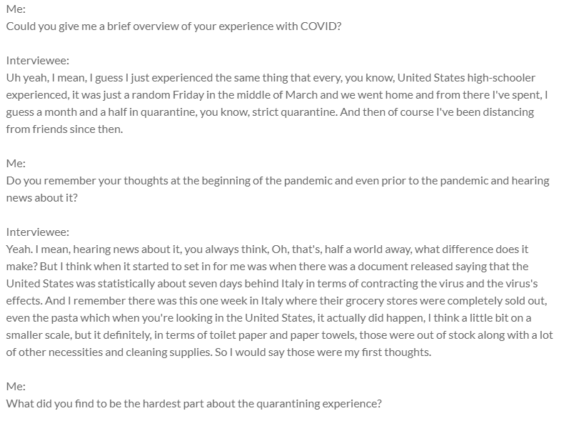 Uh yeah, I mean, I guess I just experienced the same thing that every, you know, United States high-schooler experienced, it was just a random Friday in the middle of March and we went home and from there I've spent, I guess a month and a half in quarantine, you know, strict quarantine. And then of course I've been distancing from friends since then.