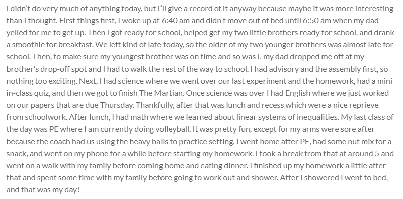 I didn’t do very much of anything today, but I’ll give a record of it anyway because maybe it was more interesting than I thought. First things first, I woke up at 6:40 am and didn’t move out of bed until 6:50 am when my dad yelled for me to get up. Then I got ready for school, helped get my two little brothers ready for school, and drank a smoothie for breakfast. We left kind of late today, so the older of my two younger brothers was almost late for school. Then, to make sure my youngest brother was on time and so was I, my dad dropped me off at my brother's drop-off spot and I had to walk the rest of the way to school. I had advisory and the assembly first, so nothing too exciting. Next, I had science where we went over our last experiment and the homework, had a mini in-class quiz, and then we got to finish The Martian. Once science was over I had English where we just worked on our papers that are due Thursday. Thankfully, after that was lunch and recess which were a nice reprieve from schoolwork. After lunch, I had math where we learned about linear systems of inequalities. My last class of the day was PE where I am currently doing volleyball. It was pretty fun, except for my arms were sore after because the coach had us using the heavy balls to practice setting. I went home after PE, had some nut mix for a snack, and went on my phone for a while before starting my homework. I took a break from that at around 5 and went on a walk with my family before coming home and eating dinner. I finished up my homework a little after that and spent some time with my family before going to work out and shower. After I showered I went to bed, and that was my day!