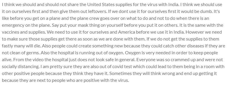 I think we should and should not share the United States supplies for the virus with India. I think we should use it on ourselves first and then give them out leftovers. If we dont use it for ourselves first it would be dumb. It's like before you get on a plane and the plane crew goes over on what to do and not to do when there is an emergency on the plane. Say put your mask thing on yourself before you put it on others. It is the same with the vaccines and supplies. We need to use it for ourselves and America before we use it in India. However we need to make sure those supplies get there as soon as we are done with them. If we do not get the supplies to them fastly many will die. Also people could create something new because they could catch other diseases if they are not clean of germs. Also the hospital is running out of oxygen. Oxygen is very needed in order to keep people alive. From the video the hospital just does not look safe in general. Everyone was so crammed up and were not socially distancing. I am pretty sure they are also out of covid test which could lead to them being in a room with other positive people because they think they have it. Sometimes they will think wrong and end up getting it because they are next to people who are positive with the virus.