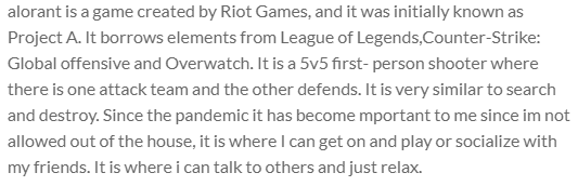 alorant is a game created by Riot Games, and it was initially known as Project A. It borrows elements from League of Legends,Counter-Strike: Global offensive and Overwatch. It is a 5v5 first- person shooter where there is one attack team and the other defends. It is very similar to search and destroy. Since the pandemic it has become mportant to me since im not allowed out of the house, it is where I can get on and play or socialize with my friends. It is where i can talk to others and just relax.
