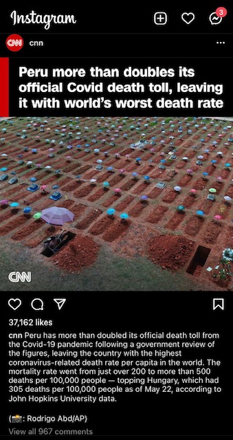 CNN- "Peru has more than doubled its official death toll from the Covid-19 pandemic following a government review of the figures, leaving the country with the highest coronavirus-related death rate per capita in the world."