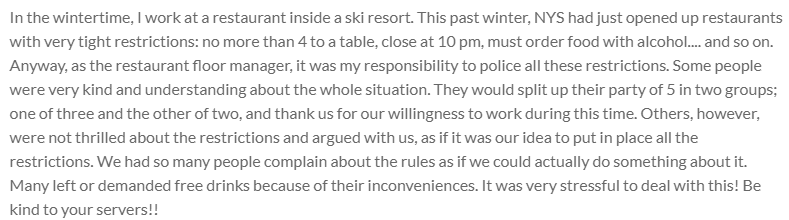In the wintertime, I work at a restaurant inside a ski resort. This past winter, NYS had just opened up restaurants with very tight restrictions: no more than 4 to a table, close at 10 pm, must order food with alcohol.... and so on.