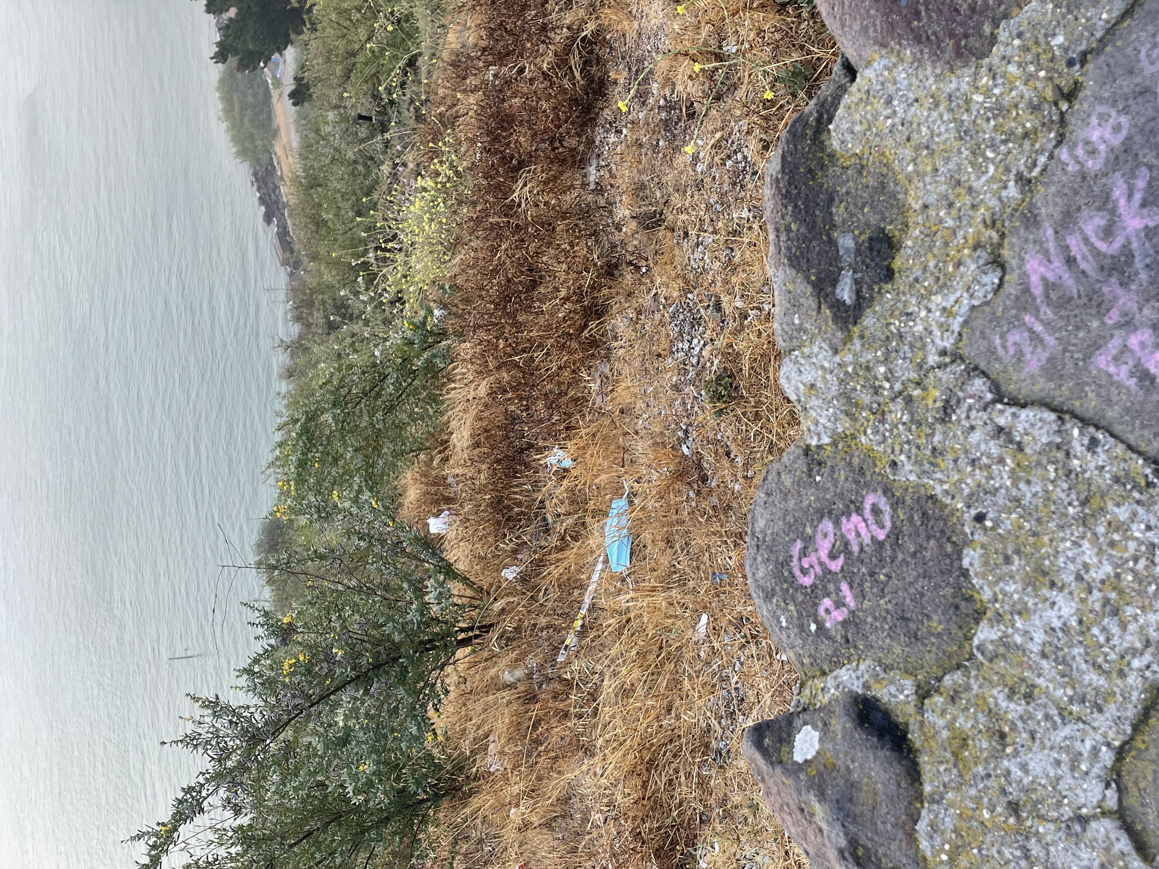 Several disposable masks littered the grounds around the Golden Gate Bridge Park on the north end of the bridge. This photo shows a blue disposable mask near a lookout.