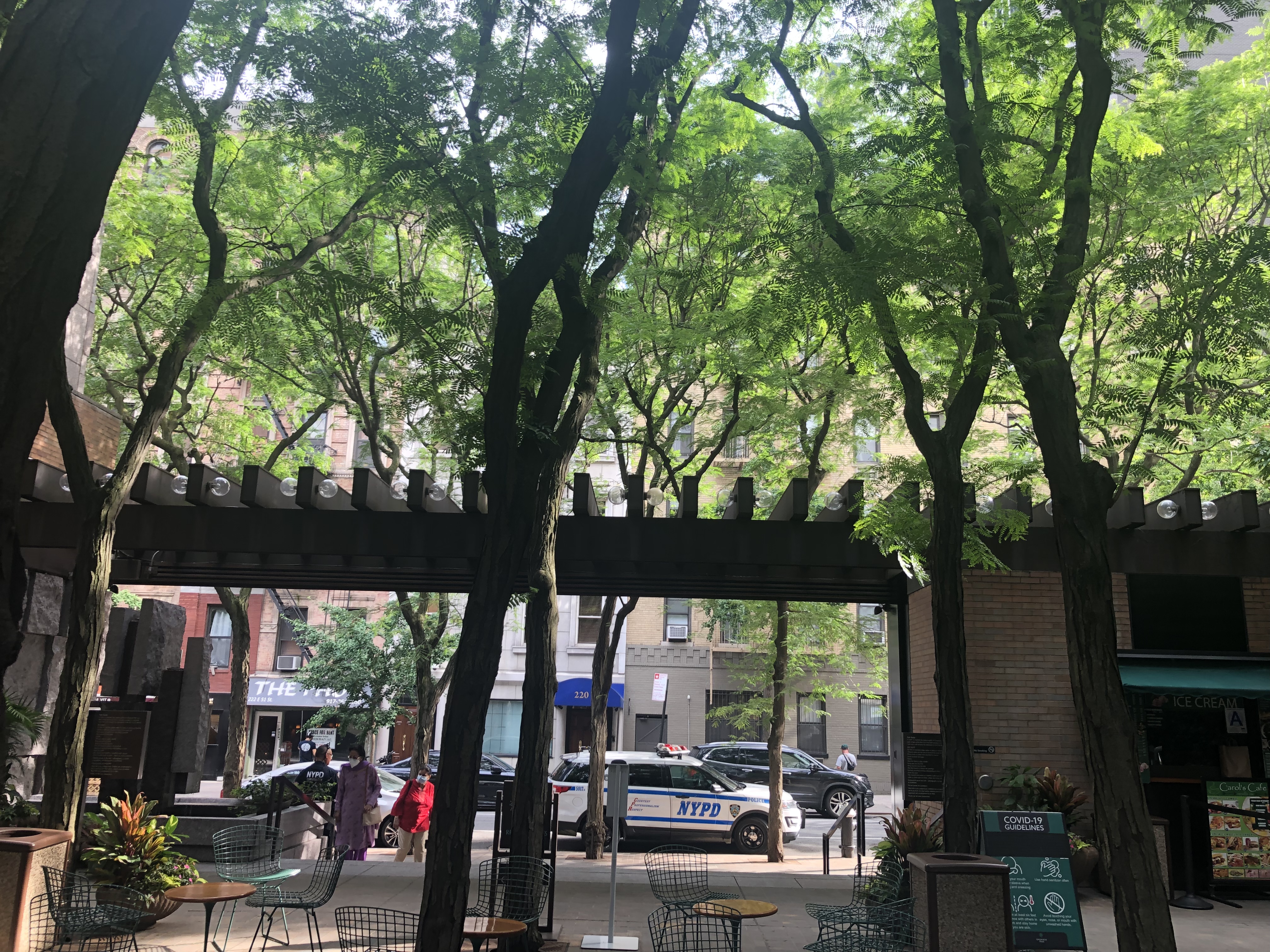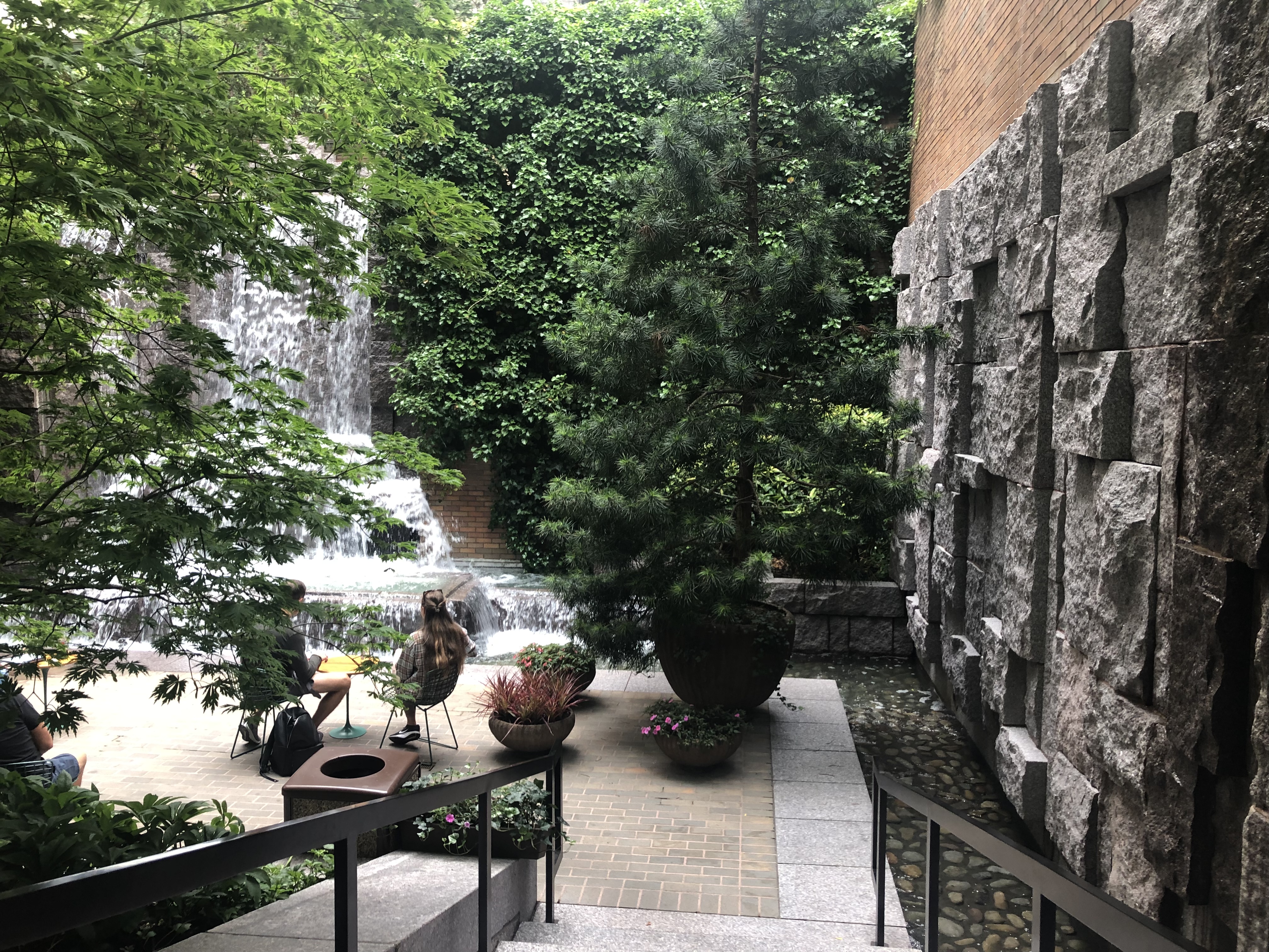 When I visited New York, one of the places I went to was Greenacre Park in Manhattan. The small, house-sized park is a wonderful example of nature in the middle of a mass of high-rises, with a wall of ivy, a waterfall, and many trees. There were about 15 people there, all doing various things. A man was working on his computer, as can be seen in one of the photos. Quite a few people were on their phones. Meanwhile, a group of tourists took a selfie photo, and a pair of elderly women shared a carton of fruit nectar. Underneath a canopy, others sat and read or worked. It was nice to see people still enjoying nature as the pandemic finally winds to a close. I also thought it was interesting how many people were using technology (including me!) in a natural space apparently meant to provide a break from the rush of normal life.