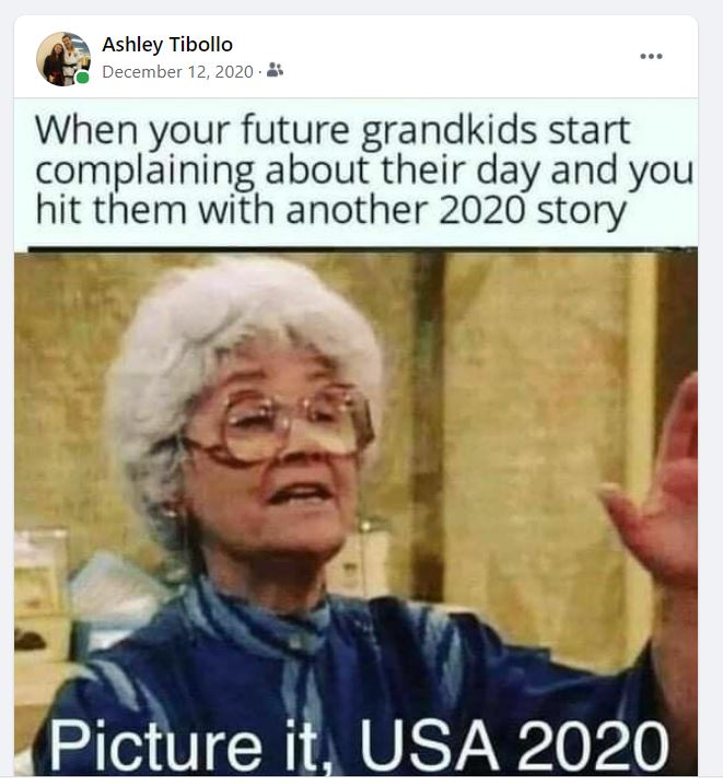 I shared this meme on my Facebook page on December 12, 2020. It uses a popular line from the character Sophia from the hit TV series The Golden Girls. In the show, Sophia would always start a humorous story about her life in Sicily with the phrase, "Picture it, Sicily 19xx..." I love that show and that character, so when I saw this meme I had to share it because I could picture myself doing this to my future grandkids. It made me laugh about a dark time, and think about life beyond the pandemic. Those of us who are lucky enough to survive it will definitely have one heck of a story to tell.